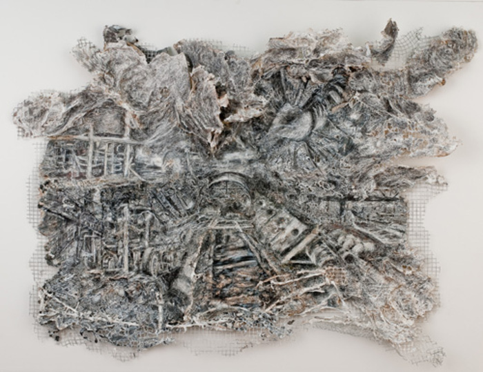 Devoured , 2008 transparency film, printing waste, acrylic paint ink and charcoal on paper 22 x 30 x 2 inches