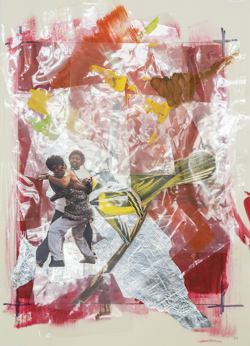 Paper, Mylar, cellophane, vinyl, shoe polish and resin on board