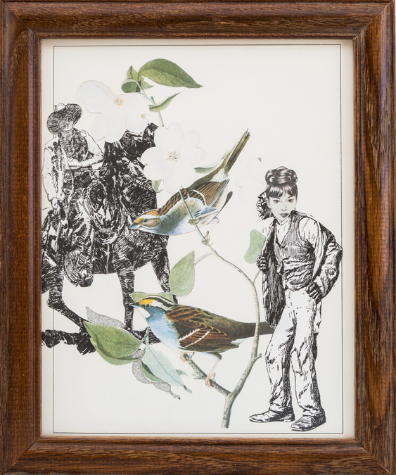 Wallpaper, Mylar, copper tape, silver tape, masking tape, paper, and shoe polish on board