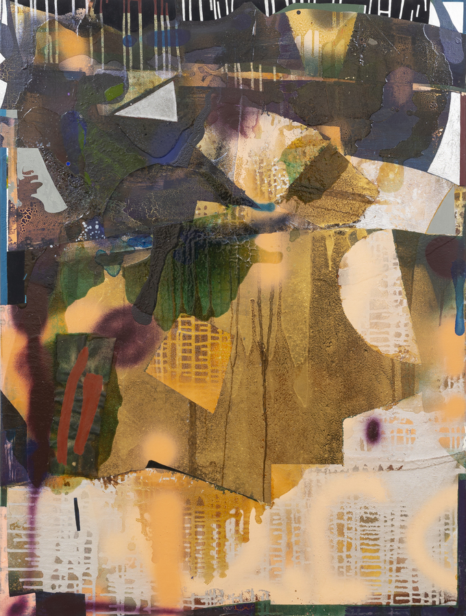 Acrylic, shellac, gouache, spray paint and paper collage on canvas