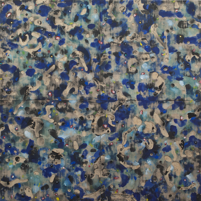 acrylic paint and gems on plywood