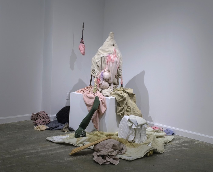 Mixed media, found objects, towels, bed sheets, blankets, synthetic and human hair, acrylic, wood, thread.