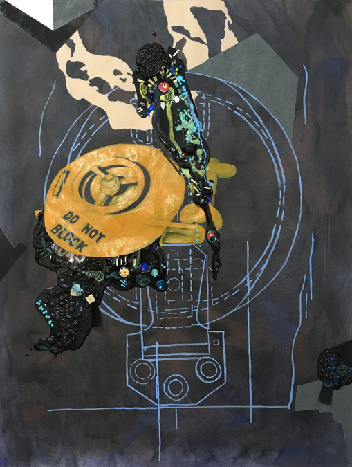 Acrylic paint, resin, graphite, nail polish, plastic, glass beads, inkjet prints and paper