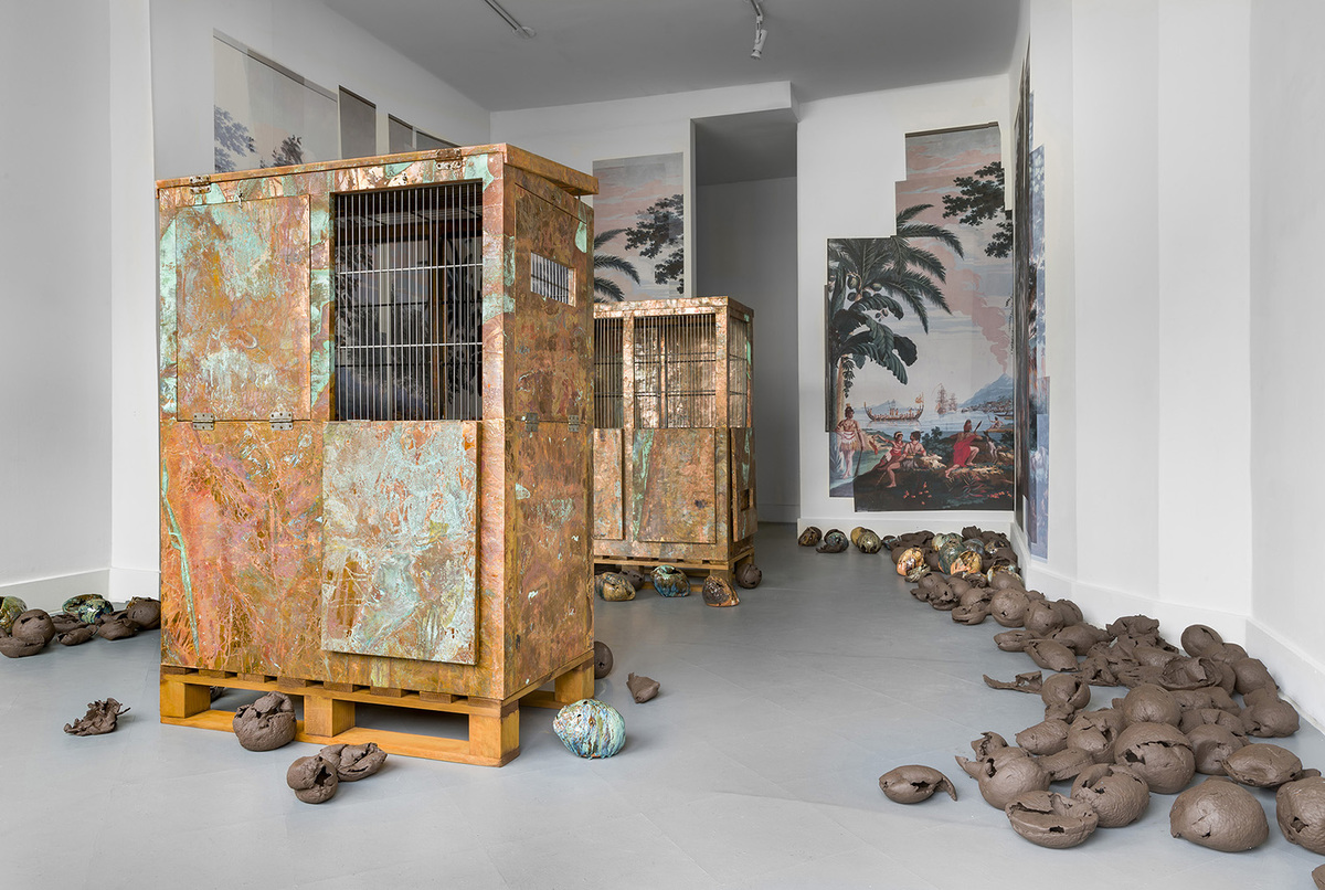 Southern Oceans, 2018 Wood, copper, steel, ceramic, digital print on adhesive 9 x 14 x 18 ft. Install View, Motel, Brooklyn, NY