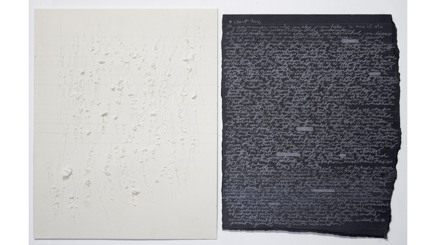 Anne Gilman, "What can and cannot be measured", 2016, Pencil, acrylic paint, graphite, incised marks on paper, Sheet: 12 x 19 inches (2 panels)
