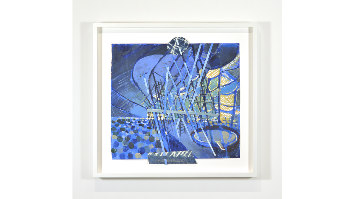 "Infrastructure," Los Angeles based artist Fran Siegel’s solo exhibition of collaged drawings and wall sculptures, encapsulates the shifting dynamics of global migration. Taking cues from Calder’s circus and Fellini’s “La Strada,” this latest body of work fuses vast urban plans with the microcosm of a traveling circus to highlight this pivotal issue. Siegel’s itinerant circus travels from town to town, pitching its temporary tent. Her Infrastructure is unstable, off-kilter and crumbling: power lines, transmitters, and structural rigs appear skeletal and transitory. Shifting perspectives generate a sense of motion and time throughout the exhibition. Viewpoints are pieced together: up, down, fractured, cut, and layered. Images are piled from ground to sky: a paper-thin stone fence hovers near the floor, light-filled paper mâché sculptures bulge from the wall, and cloud formations depict fleeting moments above.