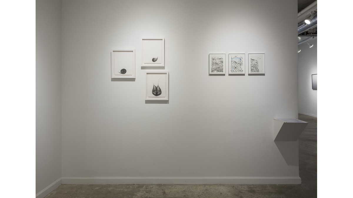 Cathy Stone’s drawings emanate from the concept of accumulation. Tethered by line, the works explore and express the process of gathering marks to create form. The nest or womb like manifestations reference scale and economy in presentation allowing each work to exist, exploring itself, while acknowledging the articulation of the other works presented.
