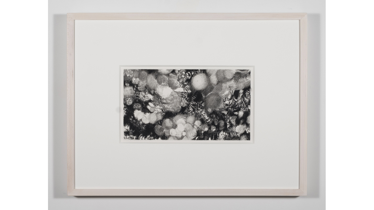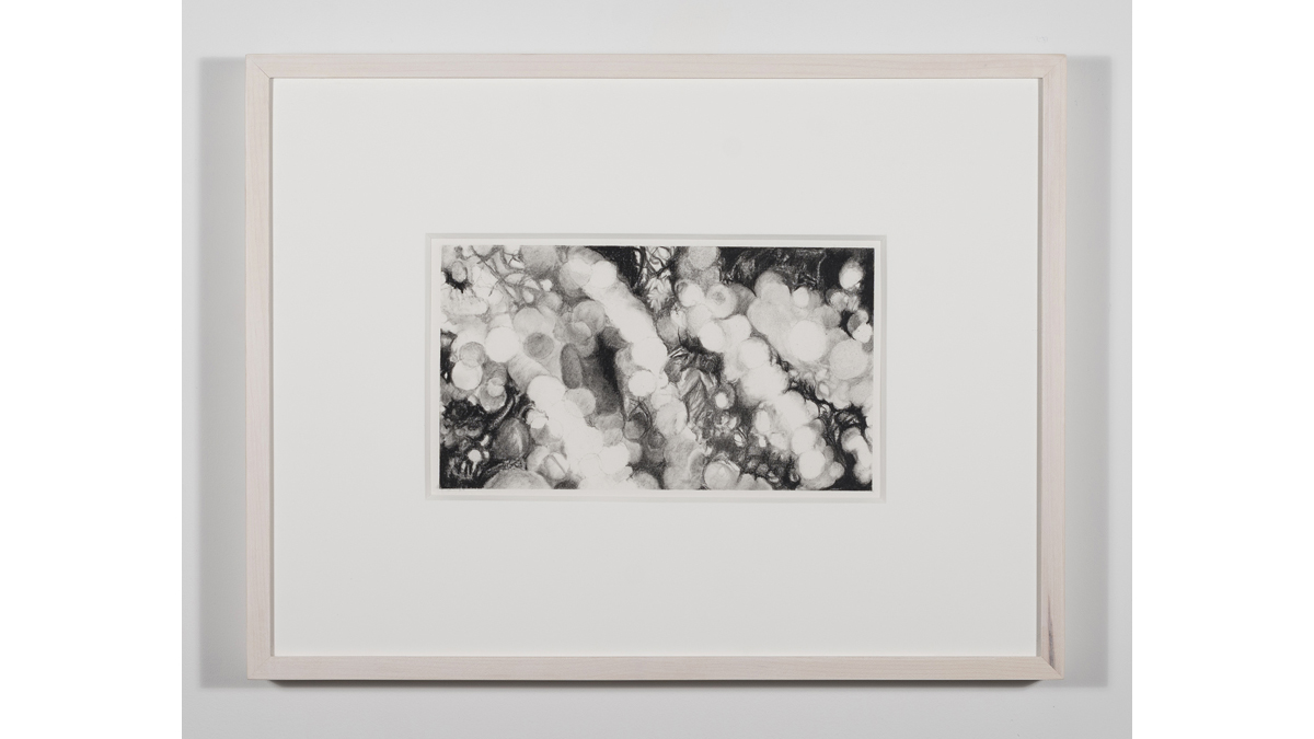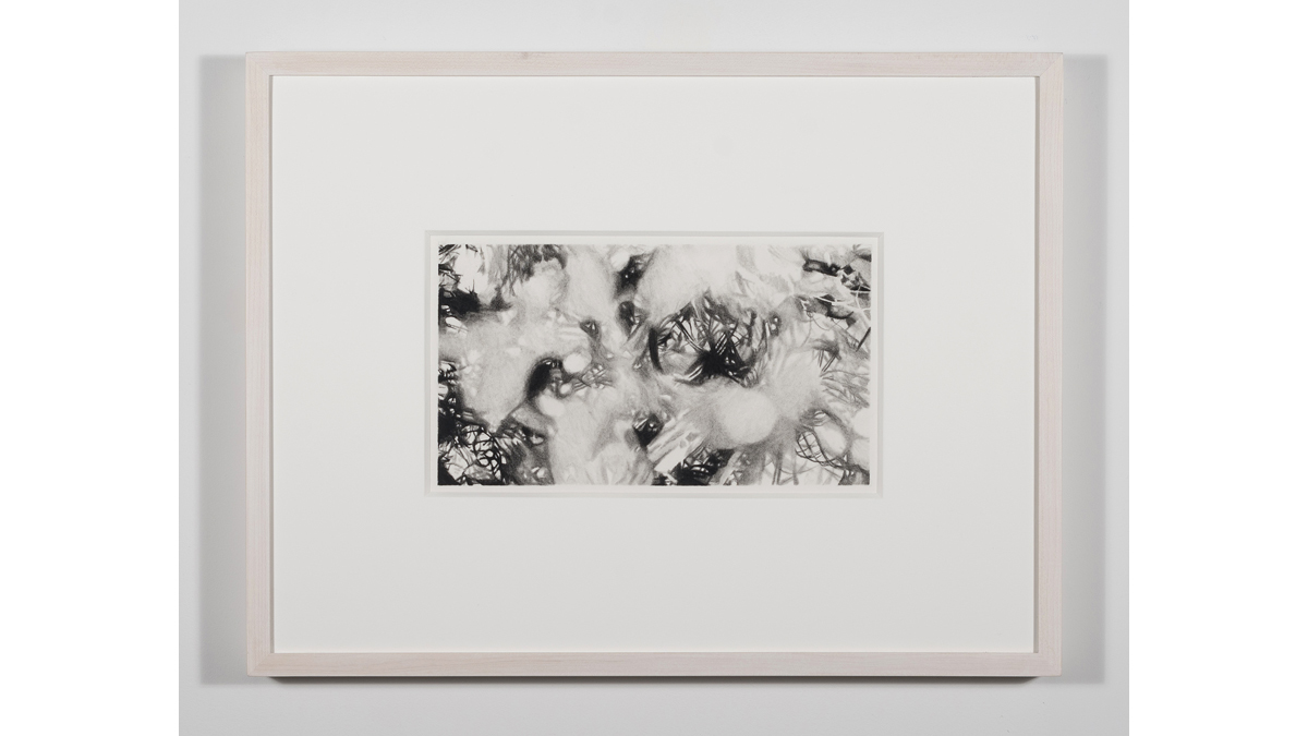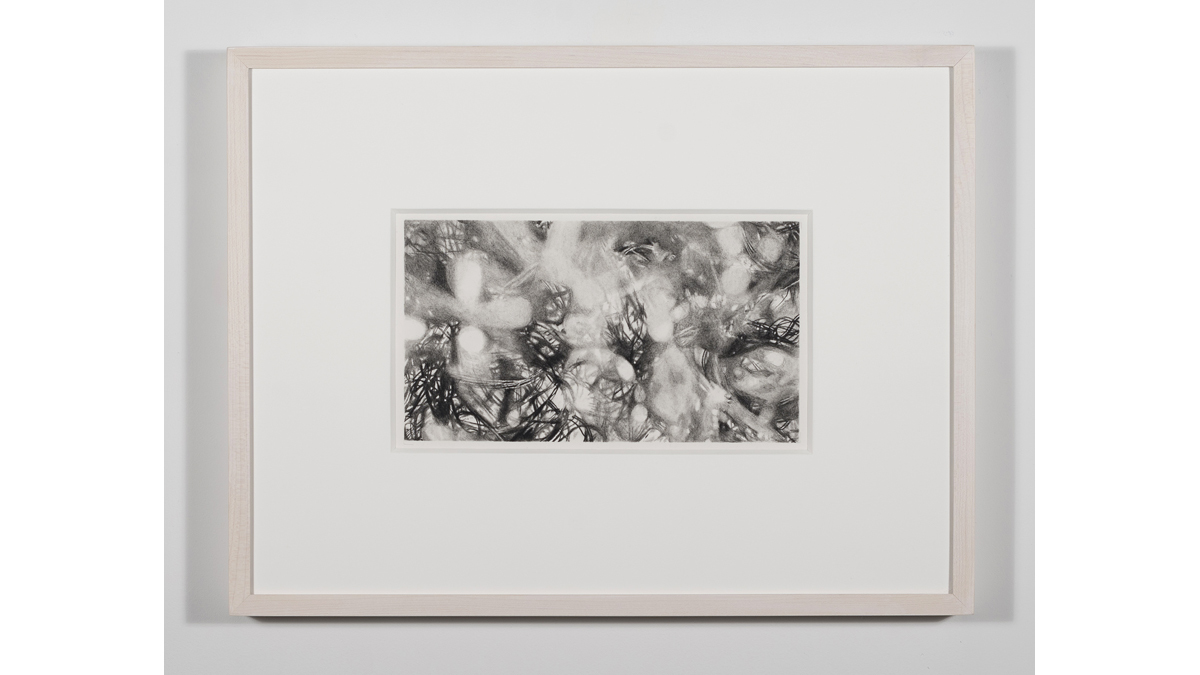 A series of small charcoal drawings installed in an alcove off the main space offers a pause to the exhibition, bringing the slow spin of the rest of the installation to a full stop. Dense, dark and scrupulously drawn, they function as frozen cinematic frames. At once sharp and hazy, these drawings read as a glimpse into the mourner’s mind, or a tangle of braids at their feet, the landscape of the lost, and the intricate connections within the brain’s integrative center of emotions, the amygdala.