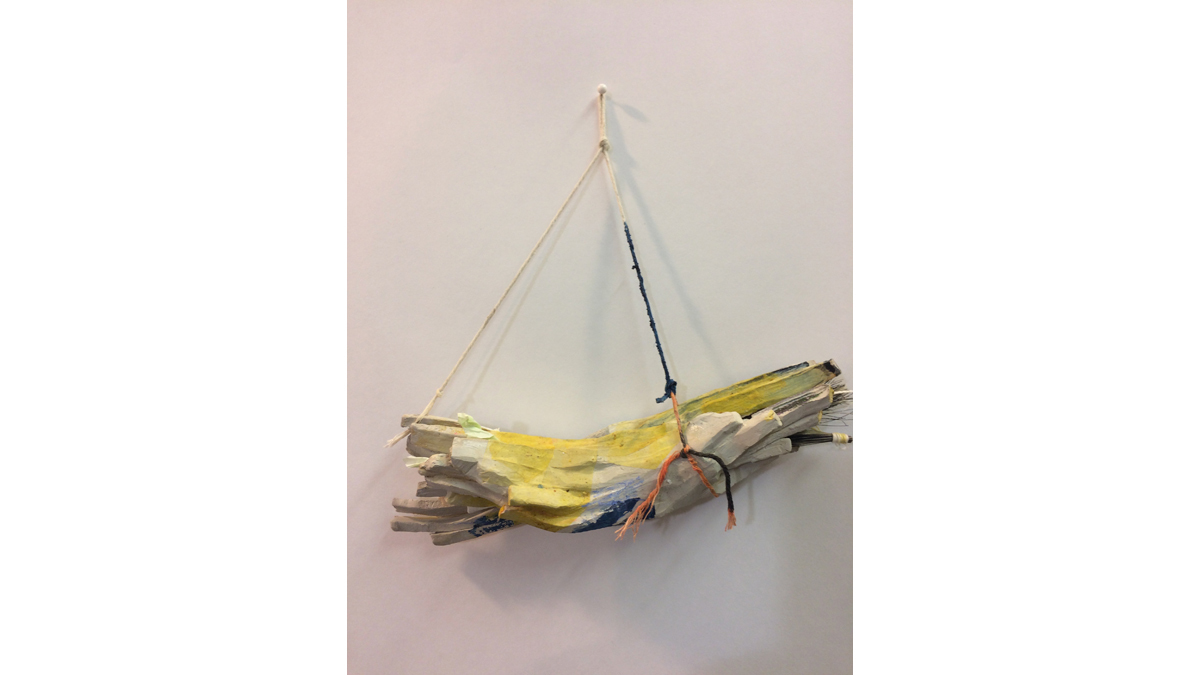Monika Zarzeczna, "dead serious", 2016, wood, aluminum flashing, twine, acrylic paint, hardware, Sharpie marker, charcoal pencil, 8.5 x 2 x 1 inches