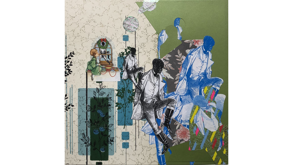 Delano Dunn, "These Dreams of His Add To Your Confusion", 2018, Paper, Mylar, wallpaper, tape, and vinyl on paper, 20 x 20 inches framed