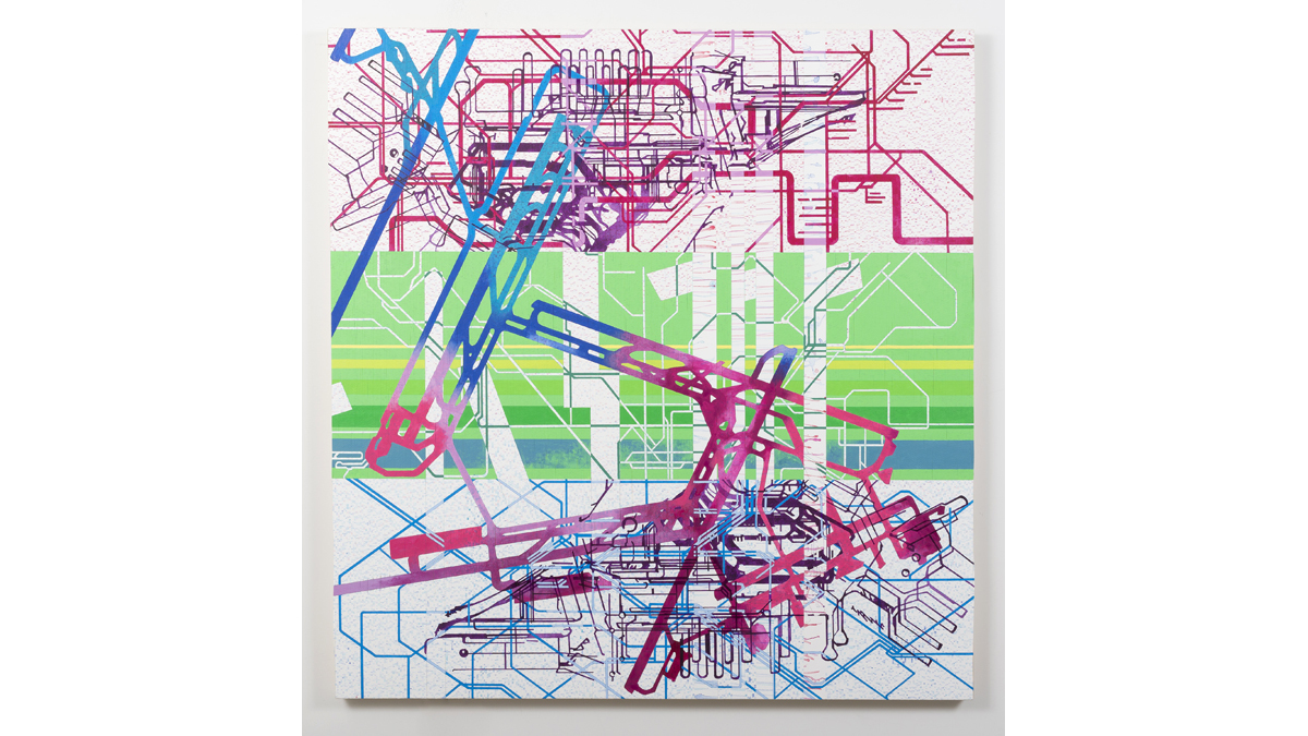 Tony Ingrisano, "Schipol", 2017, acrylic on paper, cut and rearranged, mounted to panel, 45.5 x 43.5 inches