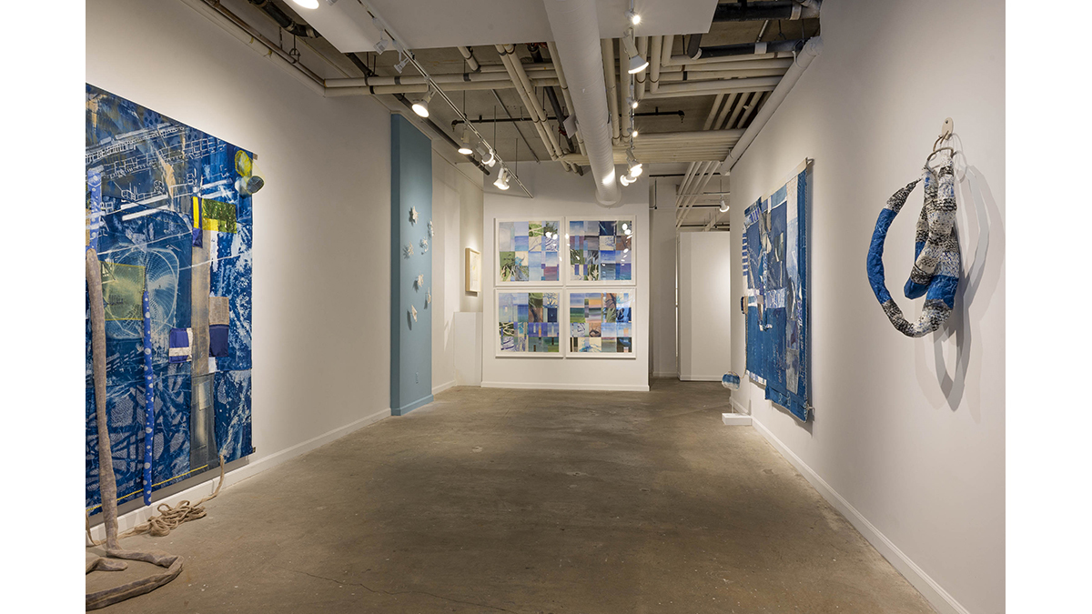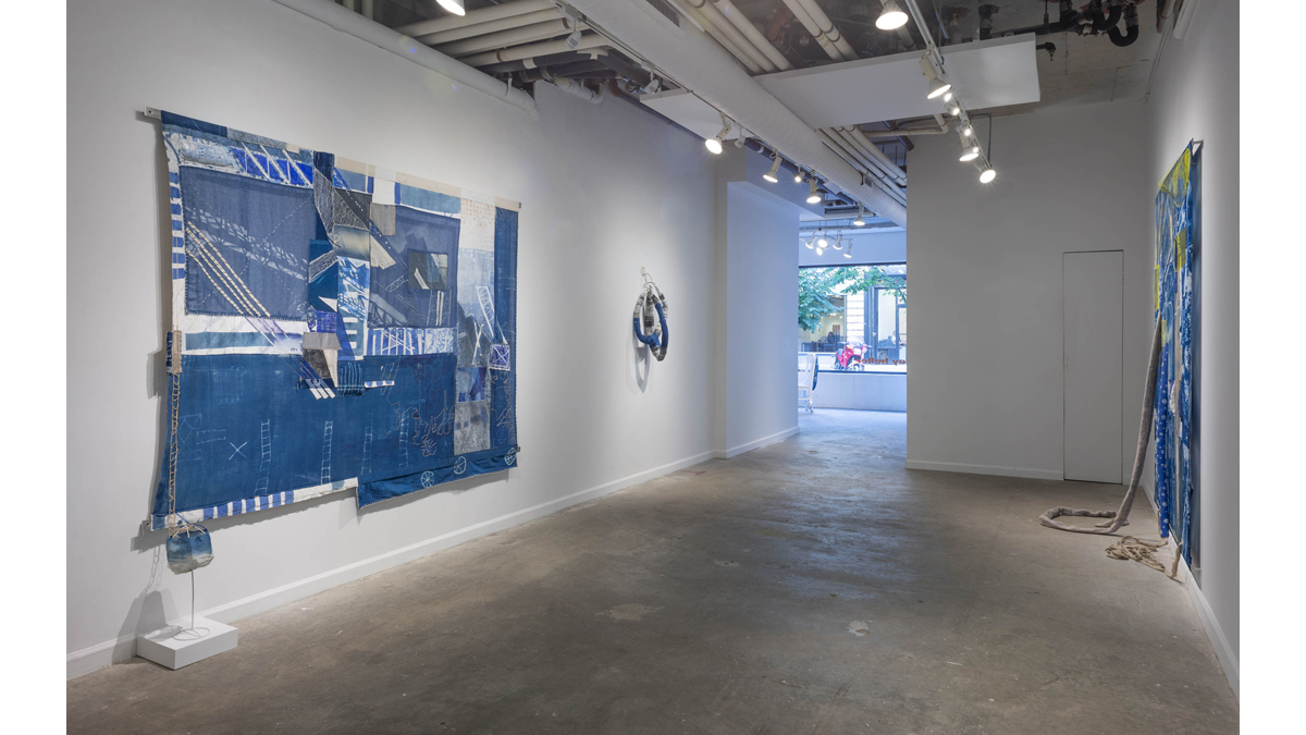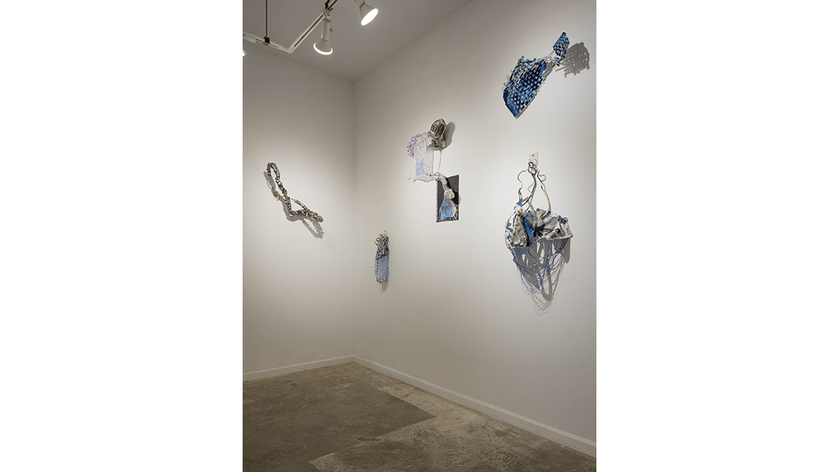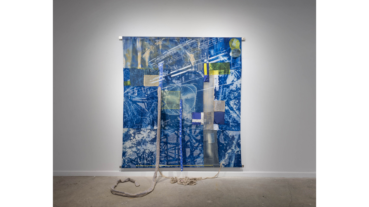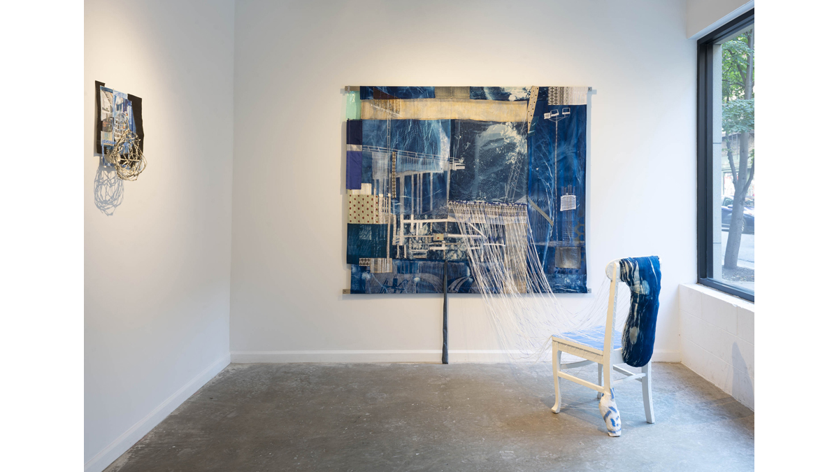 The works in Superimposition build a dialog of intricate and intertwined structures laden with cultural, ceremonial and industrial significance. Suspended like elaborate embroidered tapestries, the Rig series is a layered patchwork of information. Cyanotype sun exposures reveal ghostly under-structures of indigenous plant-life, overlaid with drawings of sprawling urban construction. The rig itself represents a temporary industrial structure imposed on a resistant native land. A relationship of exchange emerges between image sources, cultural histories and viewpoints. Protrusions extend outward from the wall as the drawing splays onto chairs, tails, and strings. These material permutations are further confronted in a series of woven paper-maché wall reliefs in impermanent states between construction and deconstruction, solid and void.