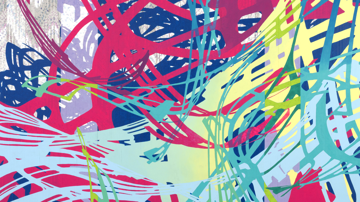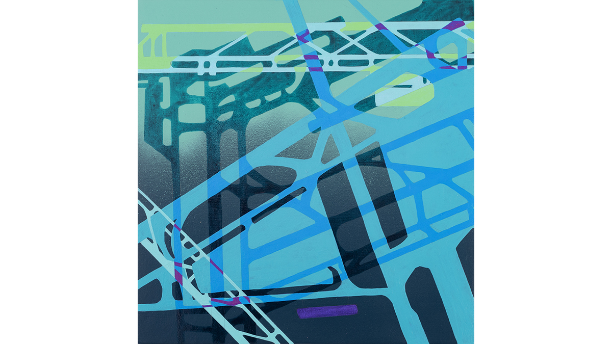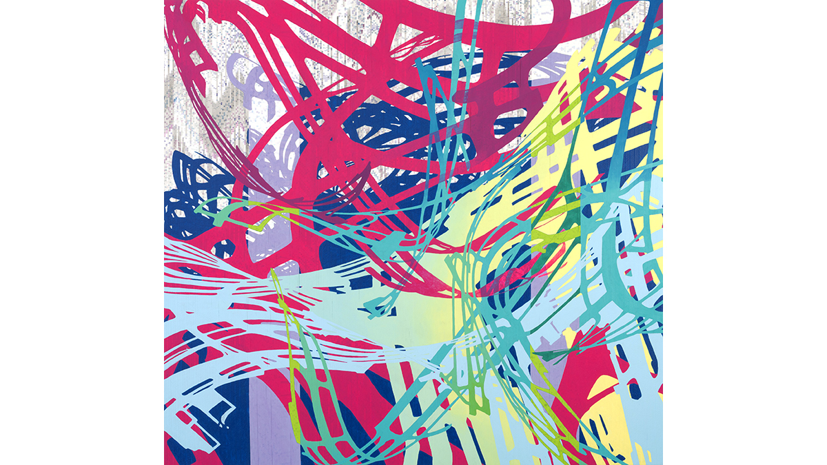 Ingrisano weaves together multiple sources of this imagery; entangling them until they lose any sense that they can locate us within a particular site. The original value of these mapping systems as “accurate” depictions and useful tools slips away and their substance as cultural symbols is disrupted. They become new maps: blueprints hinting at undefinable and unlimited spaces no longer constrained by expectation; newly designed information sets providing data on fantastical structures and systems not yet invented. Ingrisano’s work presents the territory unbound, exploded by possibility, awash in color and unfettered imagination.