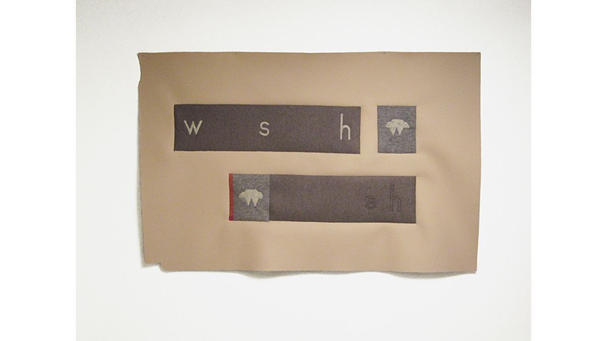 The letters 'a r' appear frequently in the felt work. “I started using them initially because I responded to the sound—like a motor.” Mozenter writes, “At the same time, it sounds the same as the word 'are' (we exist, we are alive).” Combinations of letters rarely if ever spell a recognizable word, but are instead suggestive of sounds and the types of breath required to make them. The title of the piece “w s h" for example is essentially a long exhale; almost a sigh.